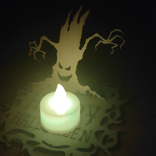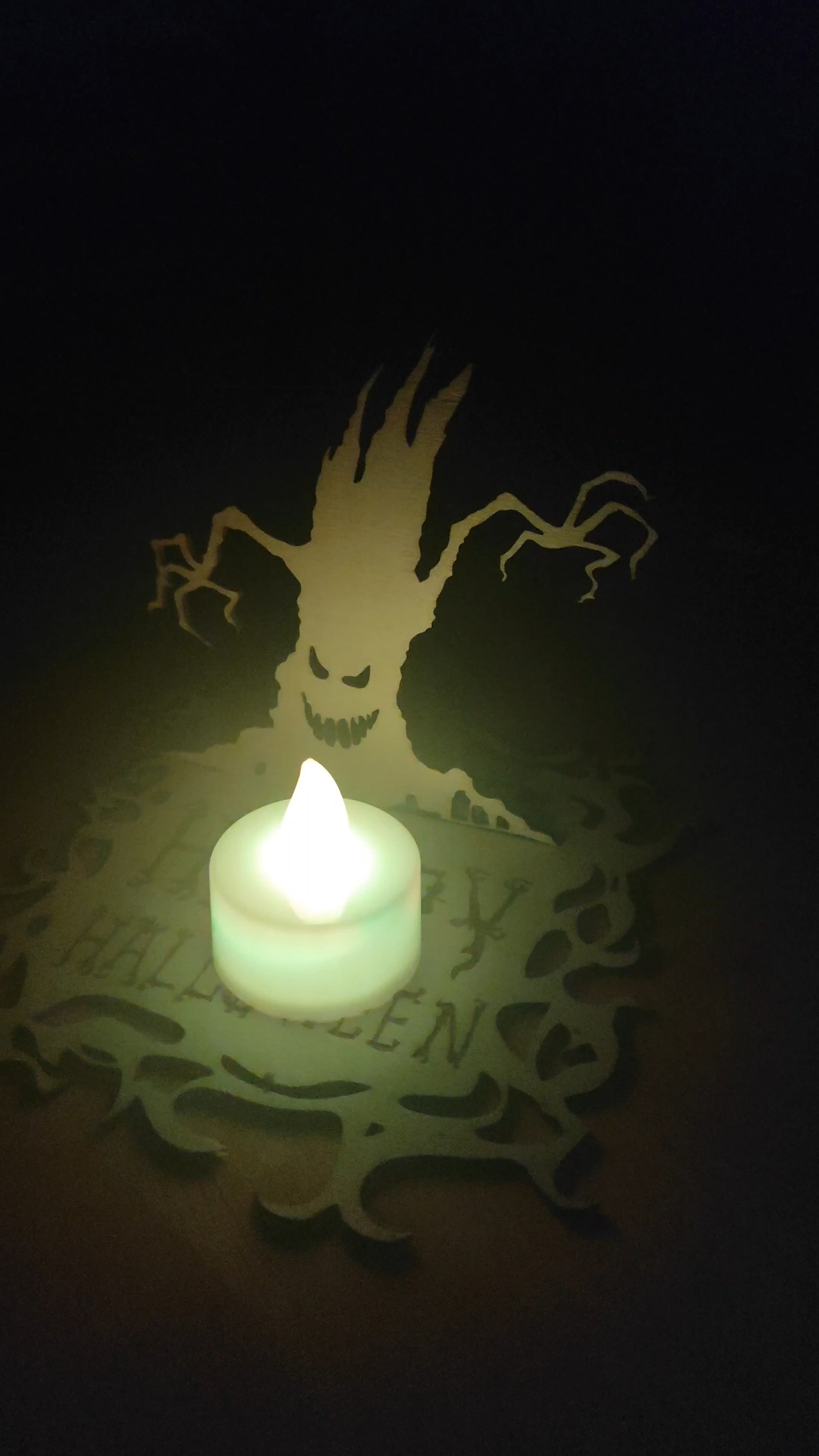 Bring the magic of Halloween to your home with this wooden candle holder featuring a spooky ghost tree. Hand-crafted from wood, this unique decor piece creates haunting shadows and adds a cozy glow to your space.